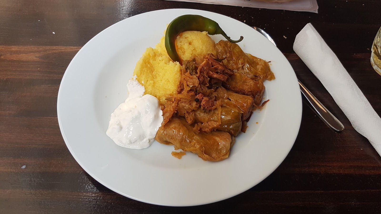 | Rather like Lithuanian Balandeliai - meat balls in cabbage rolls with sour cream and polenta |